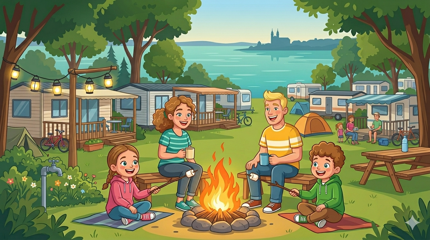 Családbarát kemping közvetlenül a Balaton partján – mobilházak, sátorhelyek és lakókocsis parcellák Alsóörsön.